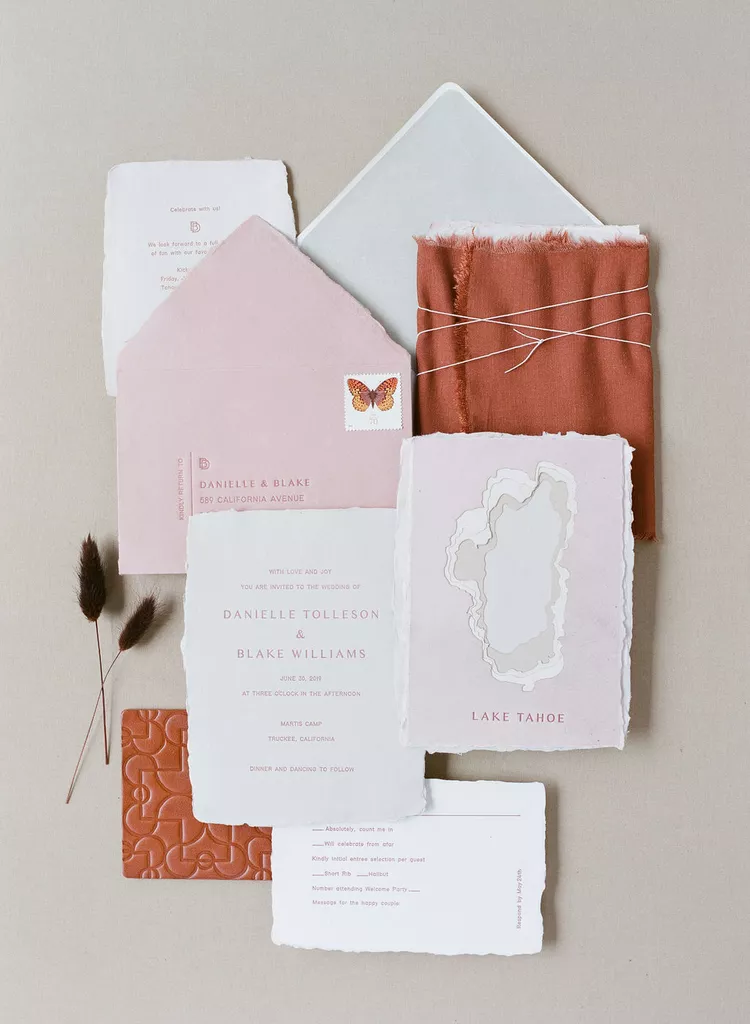 Letterpress is another custom die format, but it’s slightly more affordable than foil stamping since the printer is able to use a plastic die instead of metal, which brings the cost of production down. Many couples love this style due to its soft, romantic feel—a direct contrast to the clarity of the other styles. “With letterpress, you’re stamping ink into a nice, soft cotton stock, so the ink is absorbed,” Montgomery says. This results in a bit of bleed and blur around indented edges that give it its distinctive vintage vibe.